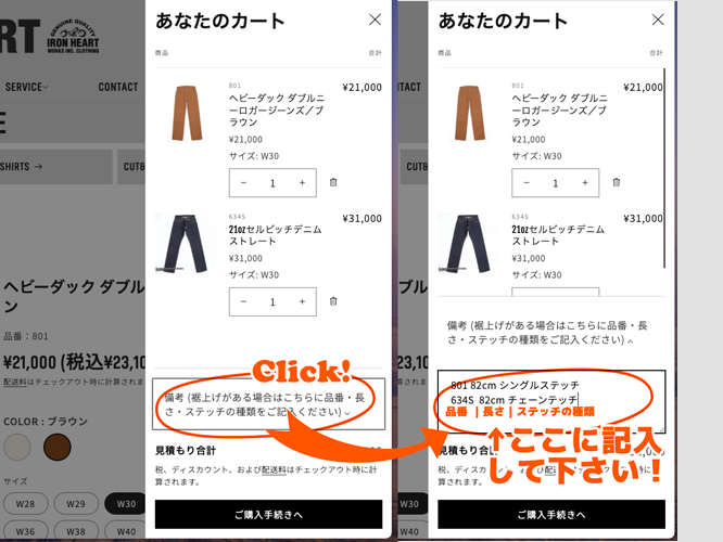 すでに長さが決まっている場合は、カート内の備考欄に [品番] [長さ] [ステッチの種類] をご記入ください。スタッフが裾上げし、商品を発送いたします。