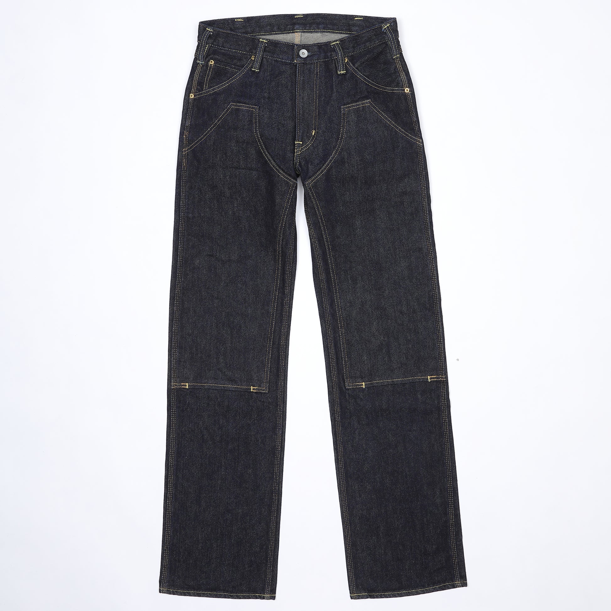 【666S-21】 21ozセルビッチデニムスリムストレートジーンズ等で使用されている21ozセルビッチデニム仕様 のダブルニーロガージーンズ - 前身の腰から裾に近い位置までダブルニー仕様にすることで強度と丈夫さを2倍に アップ。 21oz+21oz=42ozで風から身を守ります