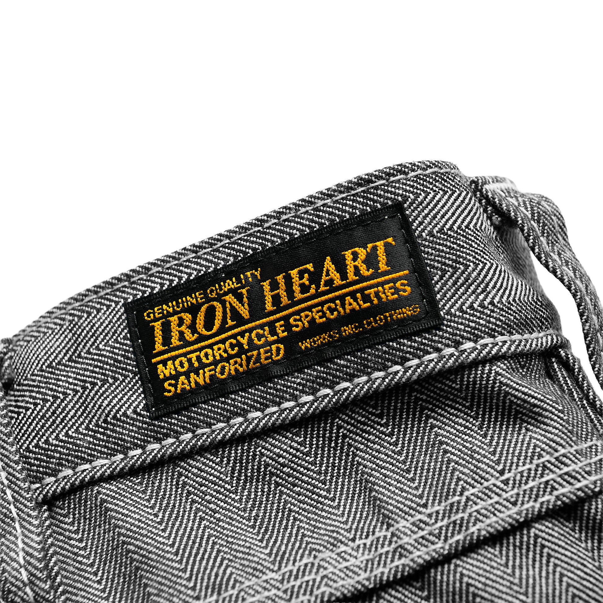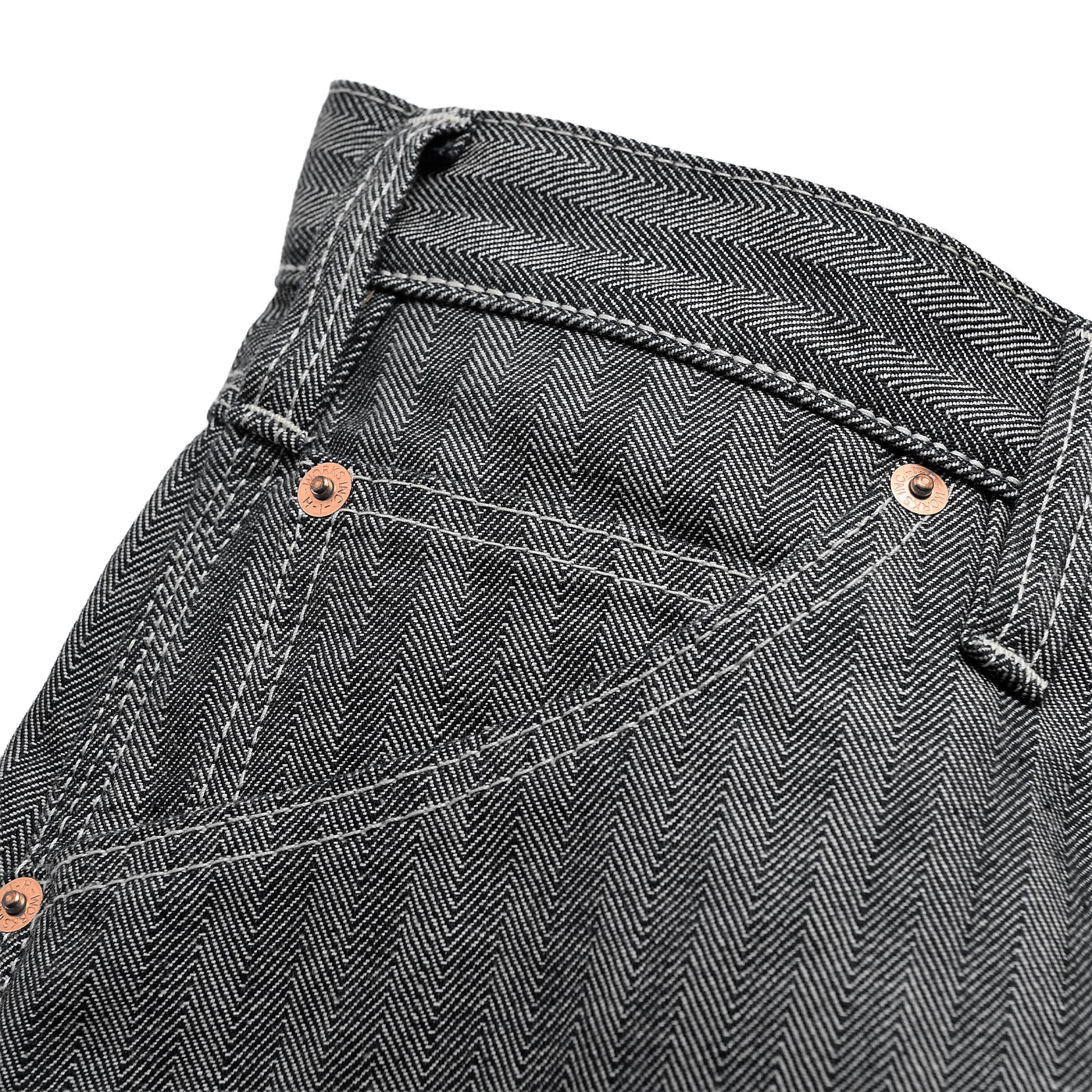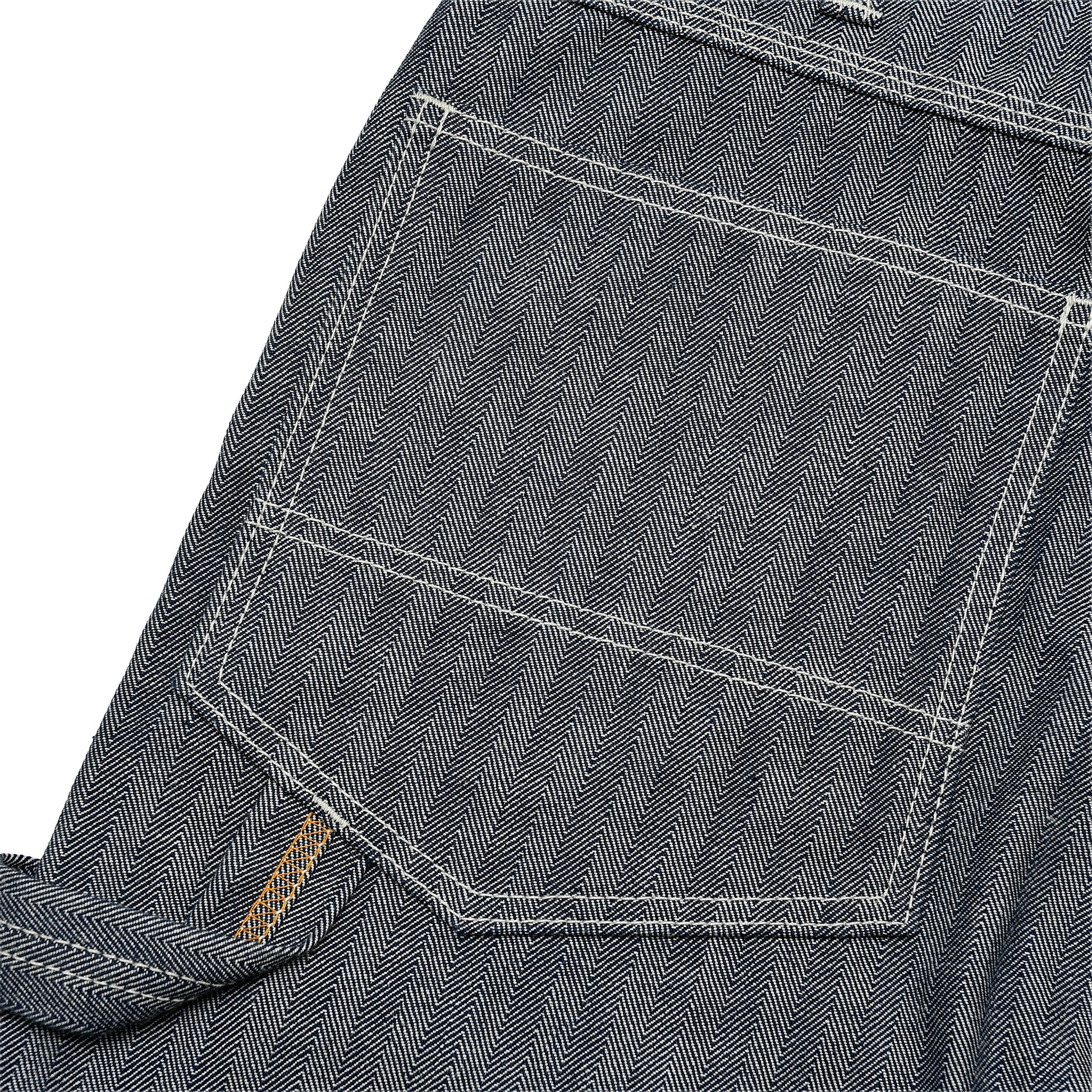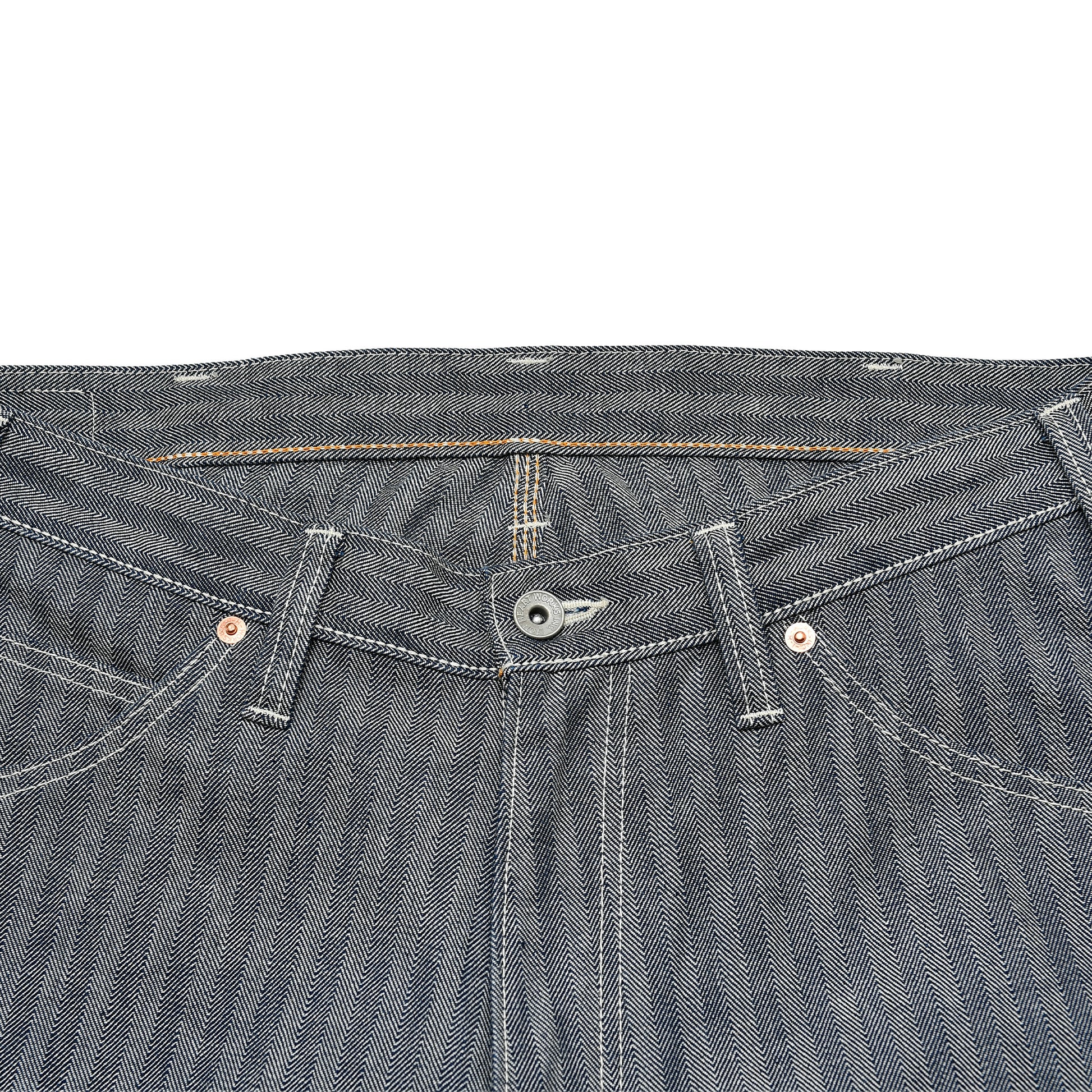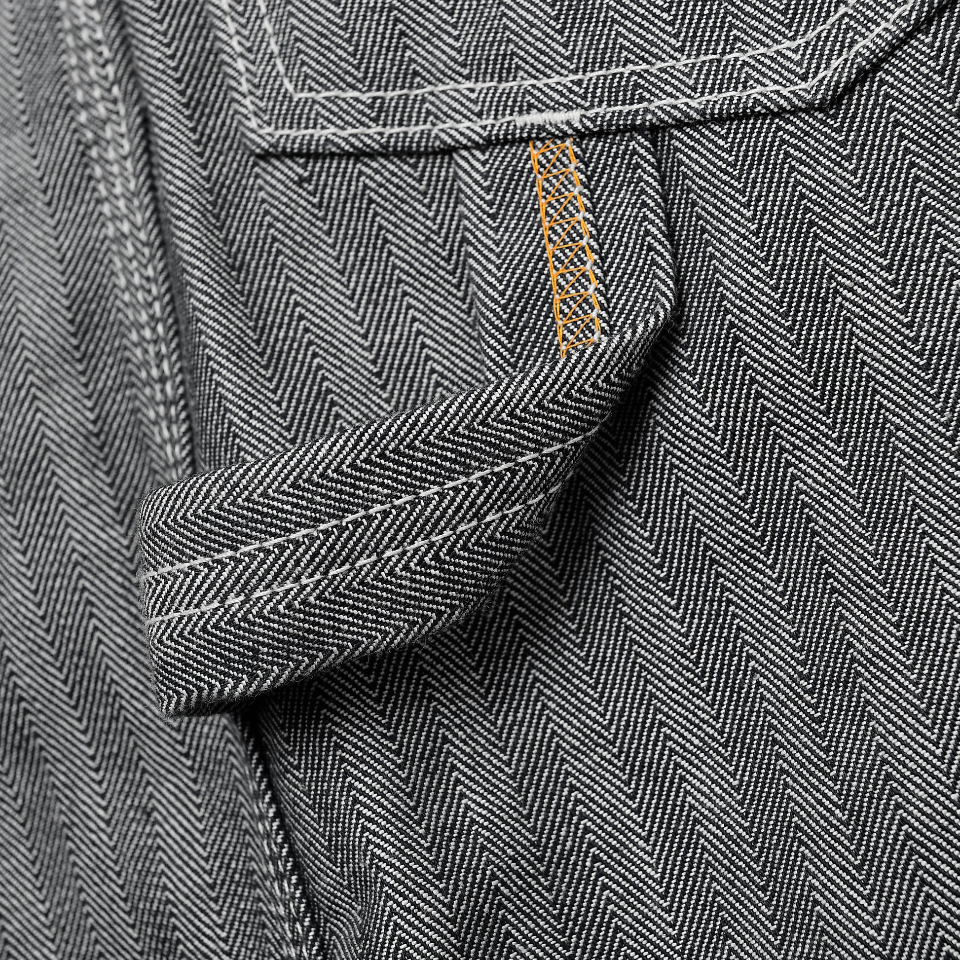 10.5ozの程よい厚みで、ヘリンボーン特有の立体的な織り柄がワークらしい雰囲気を演出。