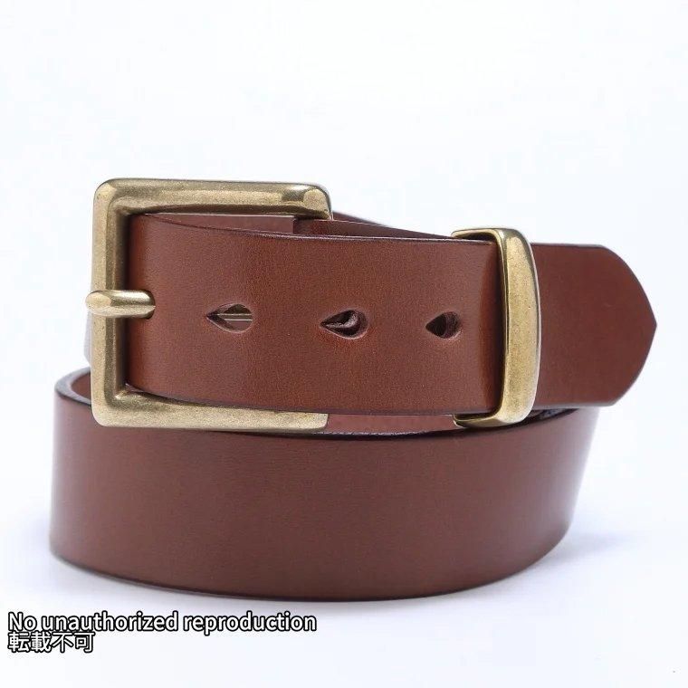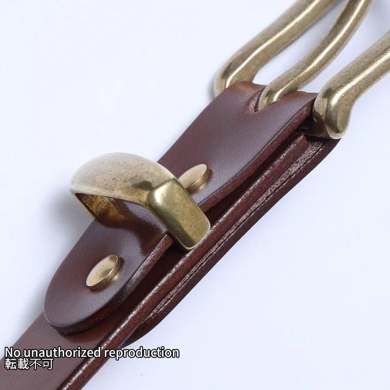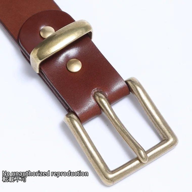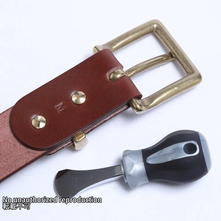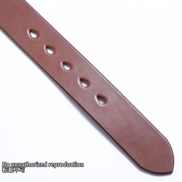 - 旧タイプのベルトは、ベルト裏にもオイルを入れて色を濃くしていましたが、それが時にジーンズに色移りするなどのトラブルを招くこともあったため、今回はオイルつけ、色付けをしていません。