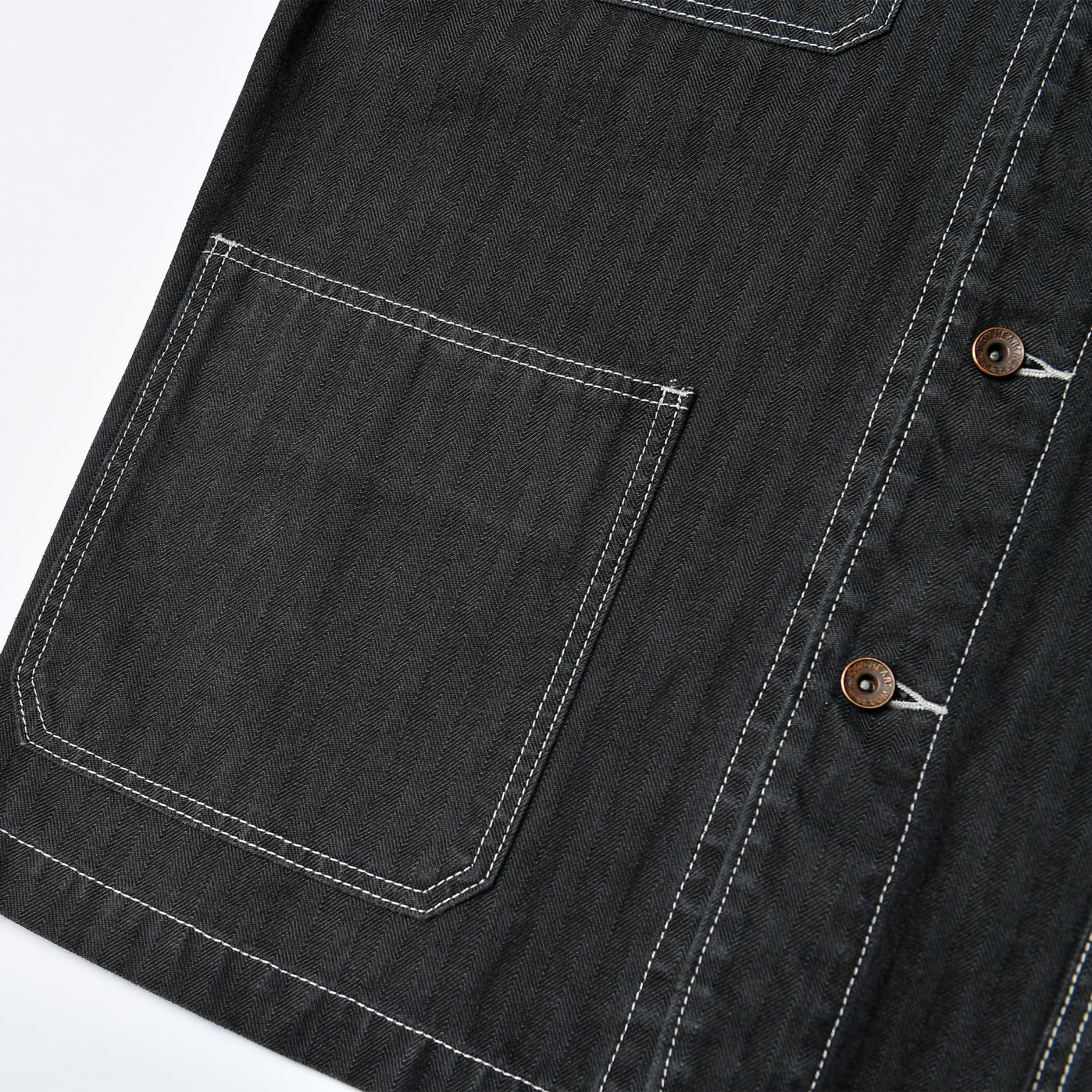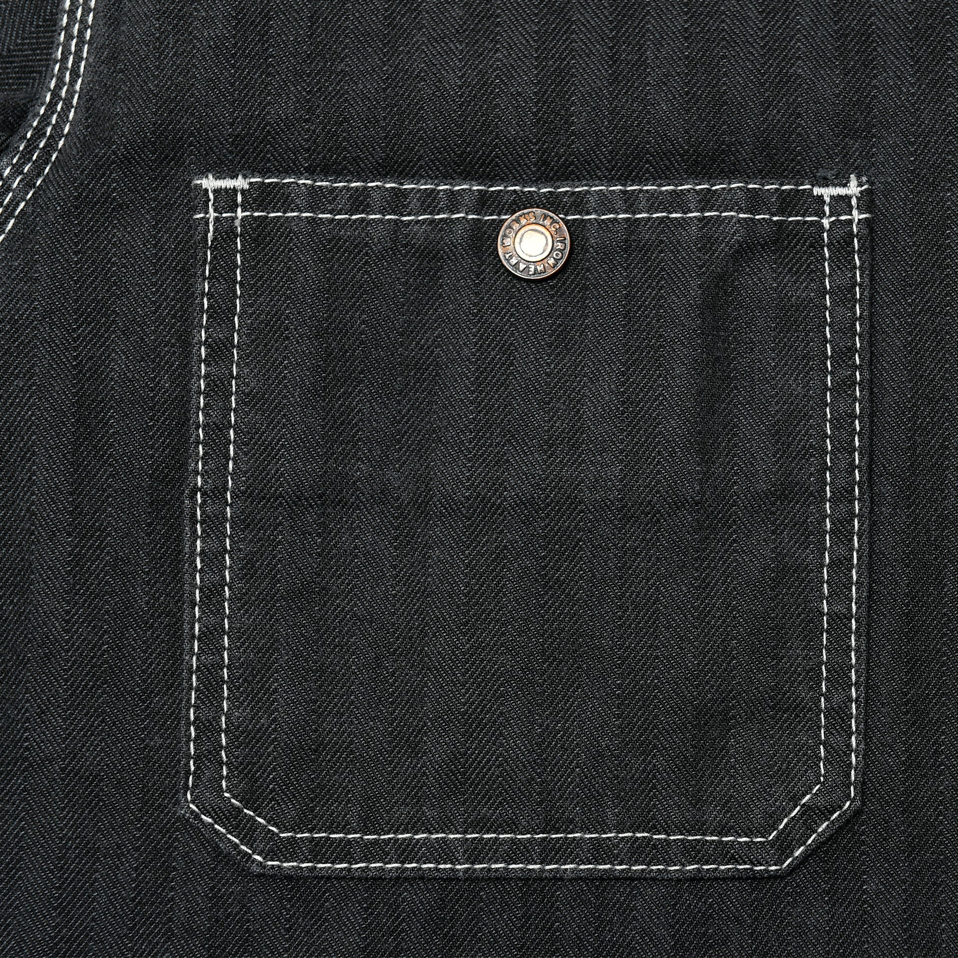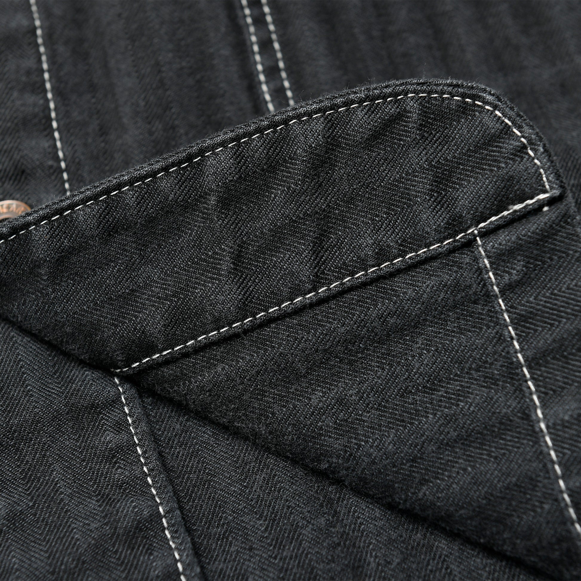 10.5ozのヘリンボーンは、経糸に硫化染めのブラック、緯糸にホワイトを配し、さらにブラックのオーバーダイを施した奥行きのある表情が魅力。
