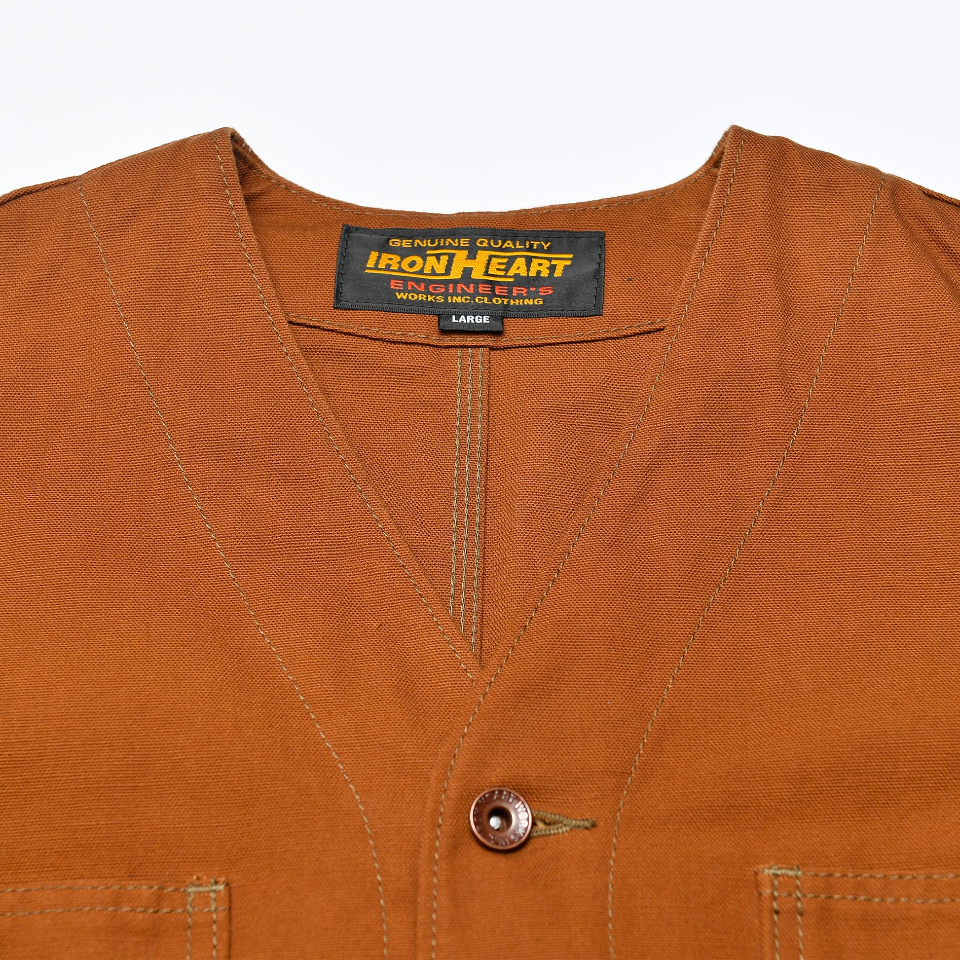 襟付きシャツと合わせても襟が干渉しにくく、首元がすっきり見えるのもポイントです。ディテールはワークジャケットらしく、随所に3本針のバリステッチを採用。