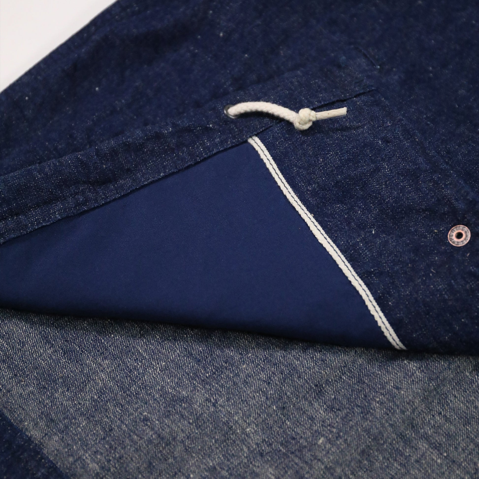 ・前見頃の見返しには生地の耳(セルビッジ)を使用し、さりげないアクセントに。