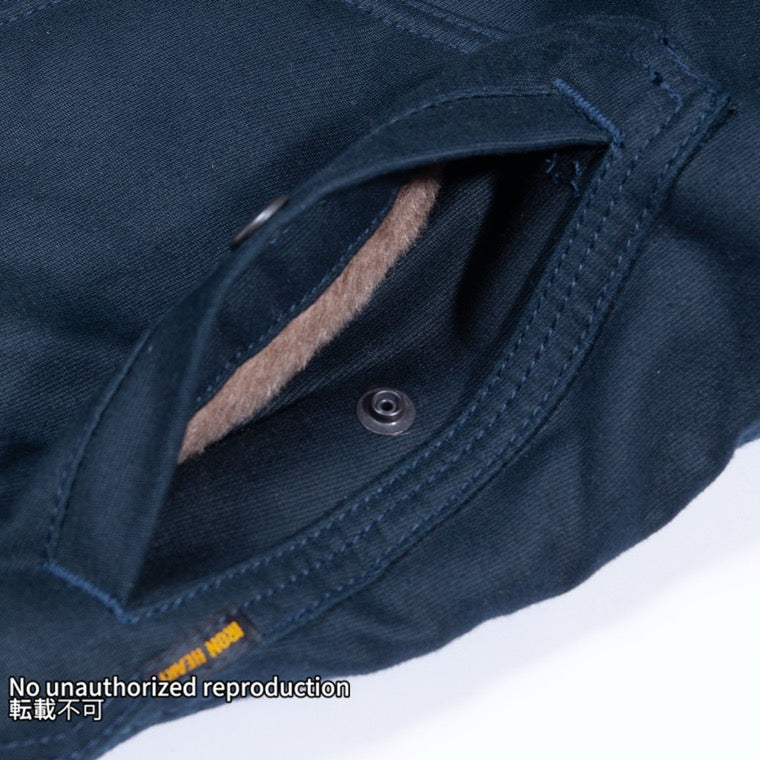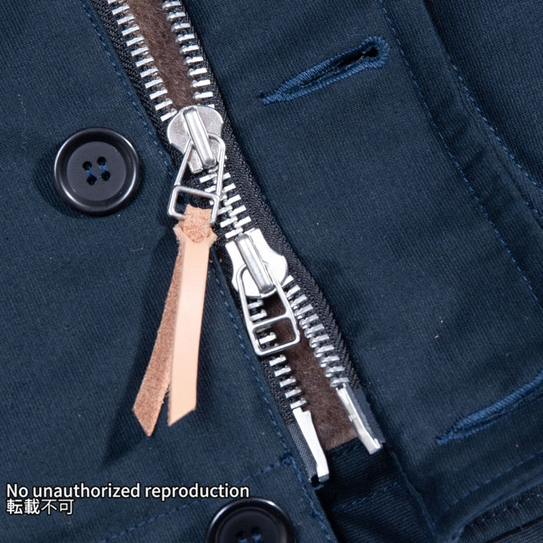 - フロントはダブルジッパー、 ボタンの二重留めでバイクで走る際の風の入りこみを防ぎます