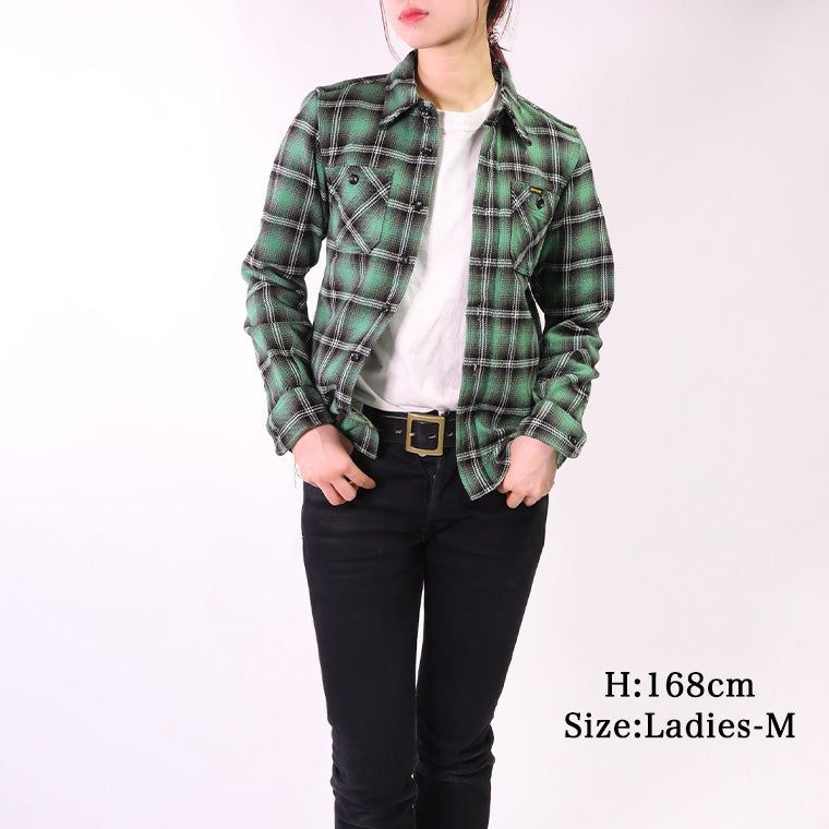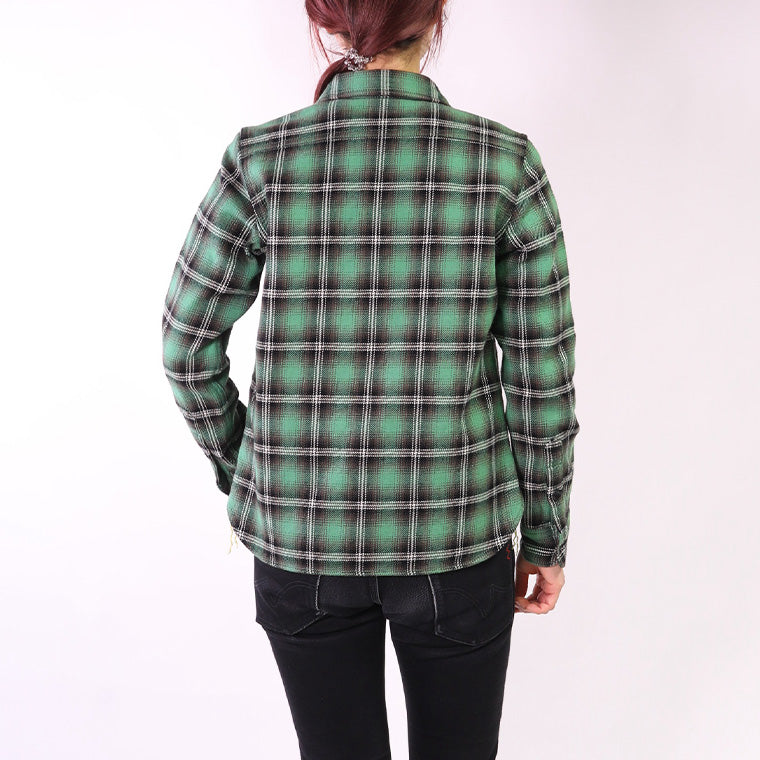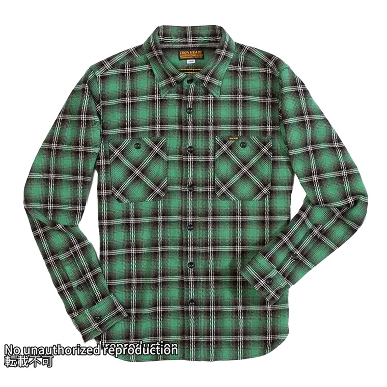 - 生地の表側を1回、裏側を2回しっかりと起毛させ、着た時の暖かみ感を重視した生地で作ったグリーン系チェック柄のワークシャツ